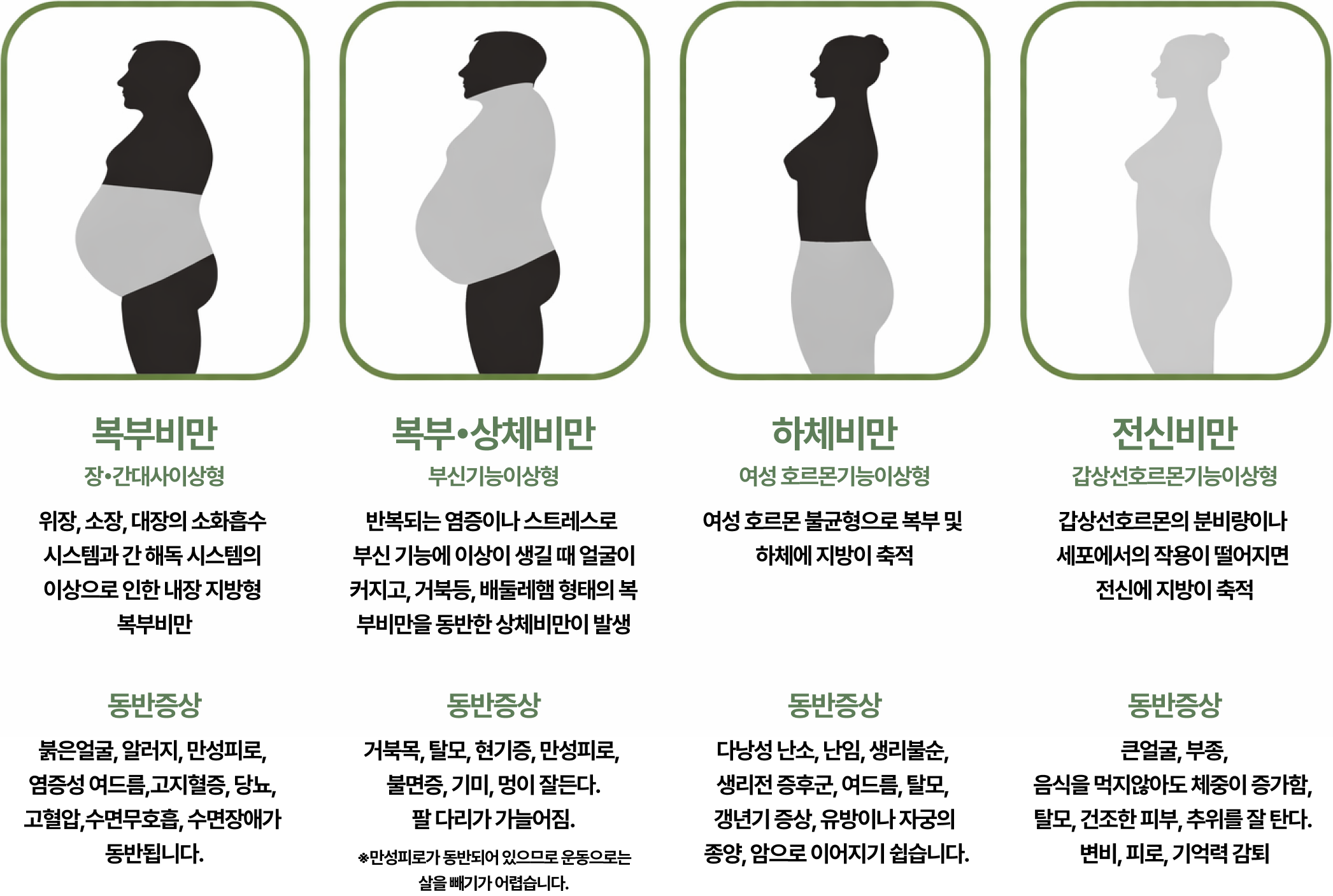하이맵에서는 비만을 단순히 체중 수치가 아닌, 전신의 대사 불균형이 드러나는 질환으로 봅니다. 그리고 이를 네 가지 바디 타입으로 구분해 개인의 체질과 대사 상태에 맞는 맞춤 접근을 제시합니다.