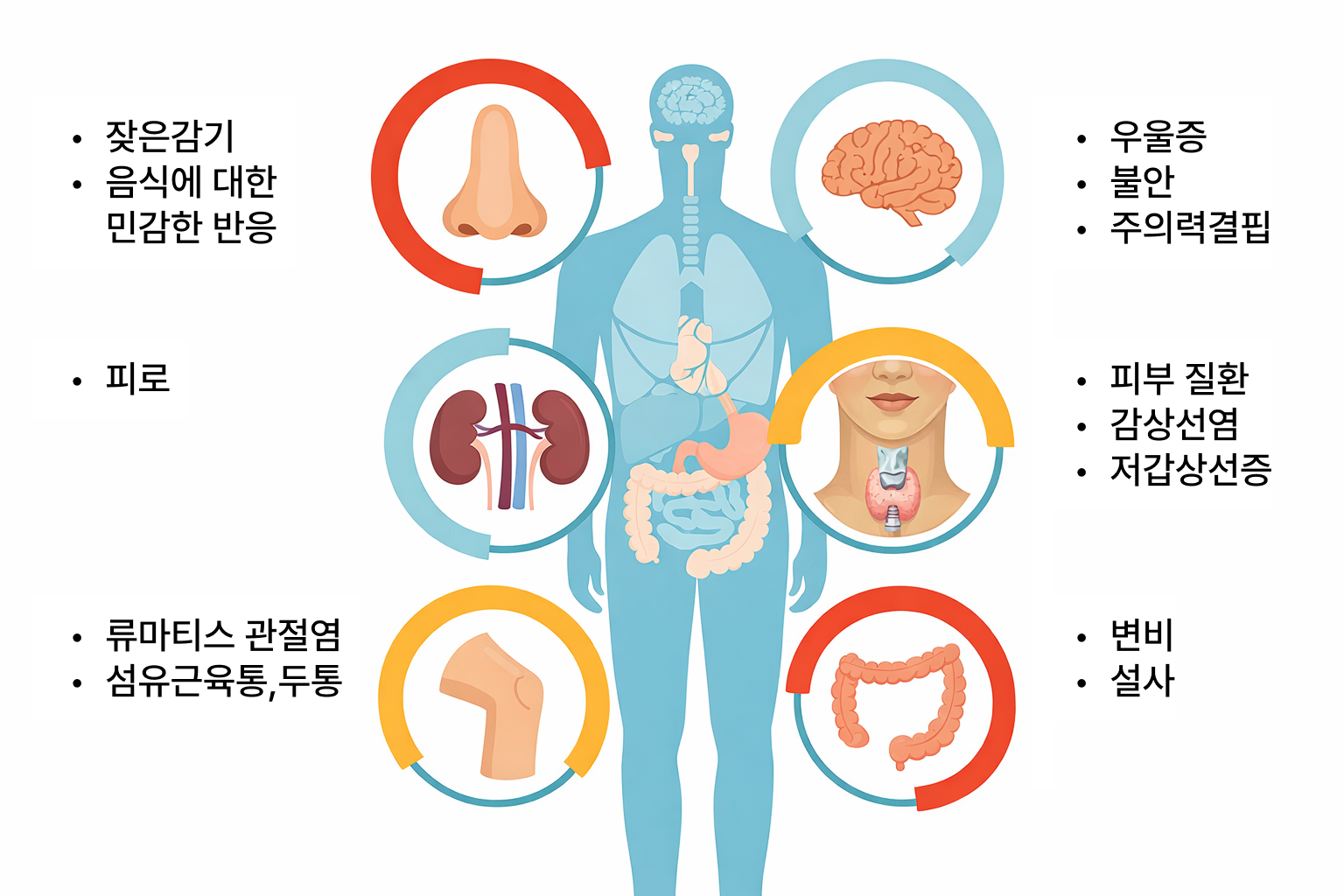 이 과정에서 면역계는 불필요하게 활성화되고, 전신 염증이 반복됩니다. 가벼울 때는 몸살처럼 피로·근육통·미열이 나타나고, 반복되면 아토피·건선·만성 두드러기 같은 피부질환이나 자가면역질환, 우울감·브레인포그 같은 신경계 증상, 지방간·인슐린 저항성 같은 대사질환으로 이어질 수 있습니다. 겉으로 소화에는 큰 문제가 없어 보여도, 장 점막이 손상되면 전신 면역과 염증 반응에 영향을 주어 피부·신경계·대사 질환으로 이어질 수 있습니다.